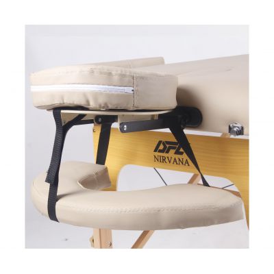 Массажный стол оснащен большой полукруглой фронтальной подлокотной полкой, классическим фронтальным подлокотником, а также двумя съемными боковыми подлокотниками, что повышает комфорт клиента и расширяет возможности использования стола при различных техниках массажа.
