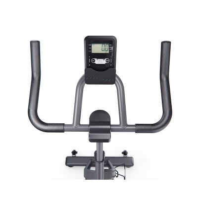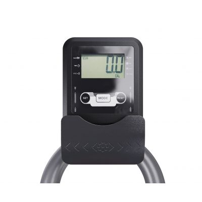Велотренажёр выдерживает вес пользователя до 110 кг. Монохромный дисплей отображает такие параметры как время, скорость, дистанция, калории, количество оборотов в минуту и режим сканирования. Консоль работает при помощи двух батареек ААА (есть в комплекте).